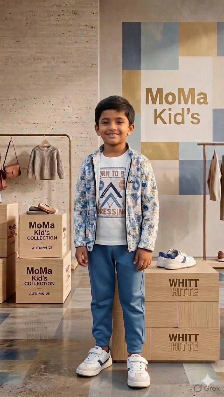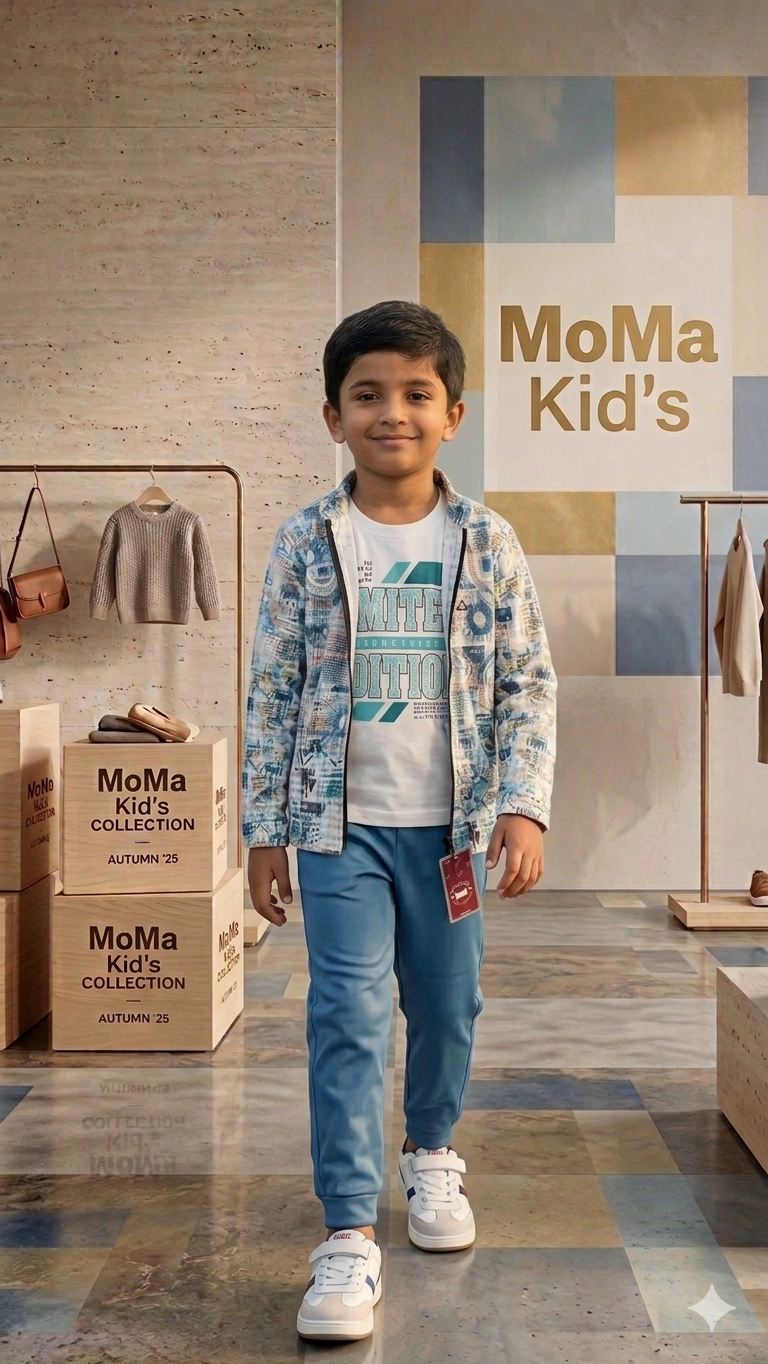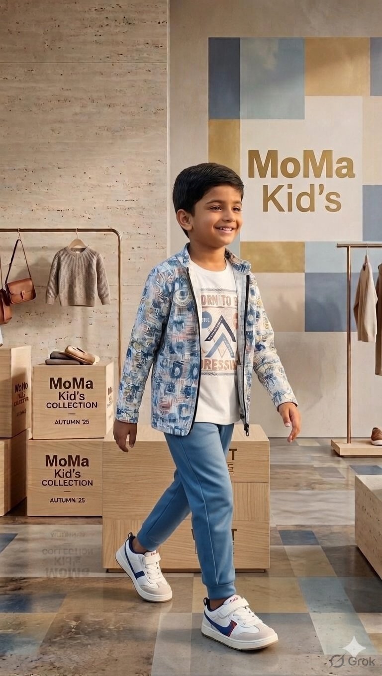 Kids’ luxury clothing, MoMa kids collection, boys’ fashion 2026, designer children’s wear, kids’ 3-piece outfit, stylish joggers for boys, children’s zip-up jackets.