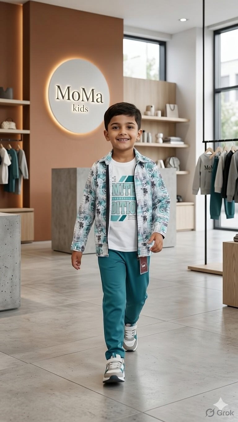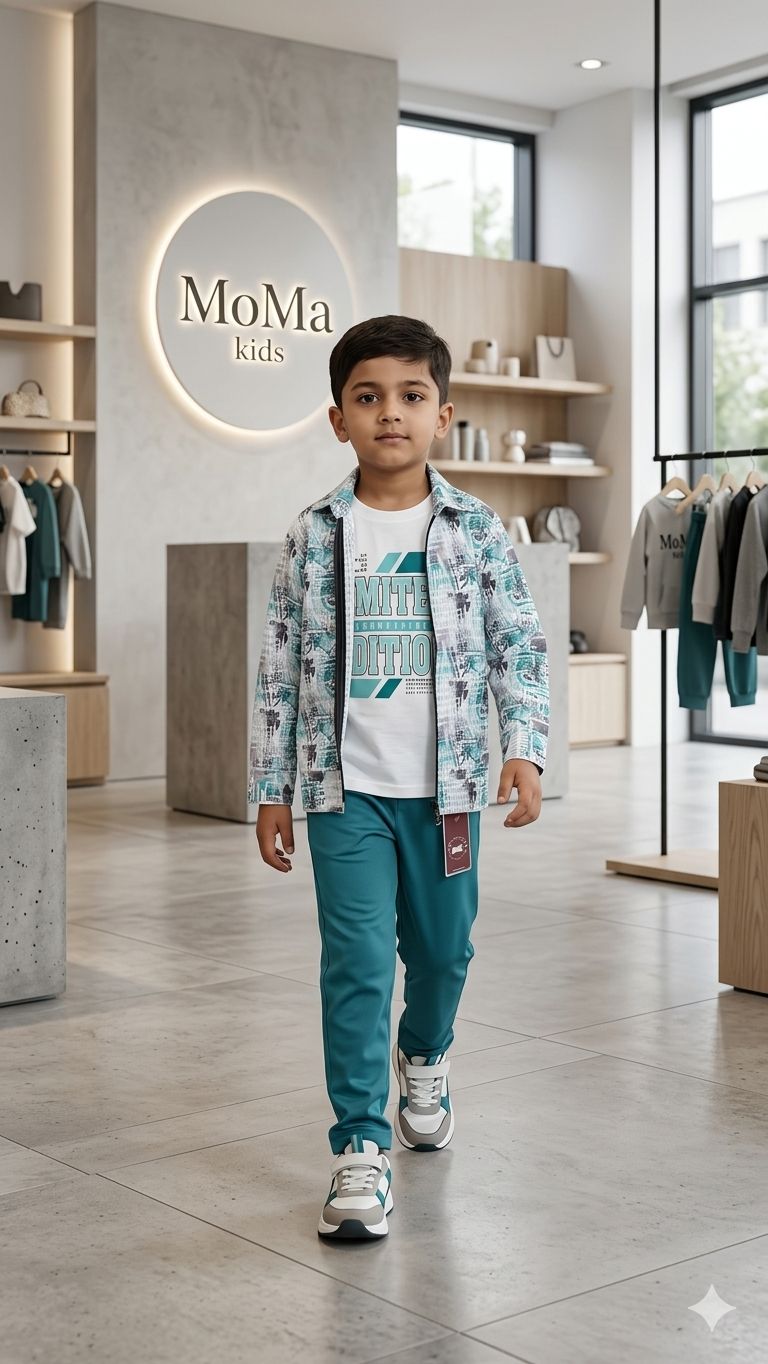 Kids’ luxury clothing, MoMa kids collection, boys’ fashion 2026, designer children’s wear, kids’ 3-piece outfit, stylish joggers for boys, children’s zip-up jackets.